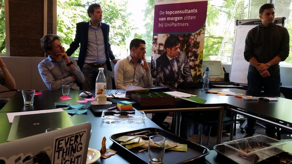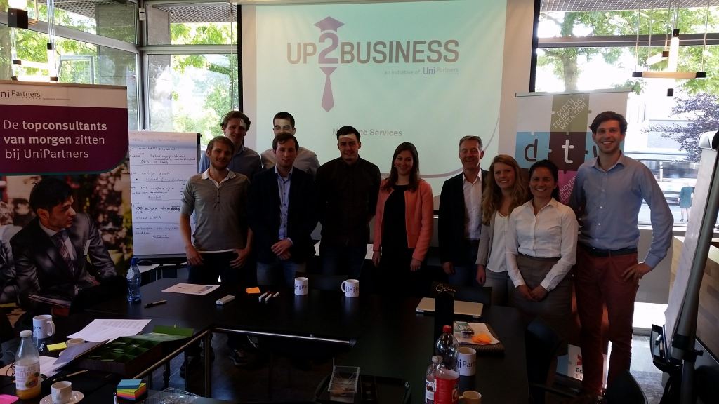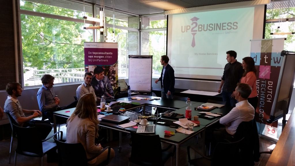 De Eindhovense studenten die vandaag samenkomen in het stadhuis hebben elkaar vooraf nog nooit gezien. Toch vormen ze voor één dag een heus bedrijf – UP2Business – dat een professionele opdracht gaat uitvoeren voor een groep van zes startups. En aan het einde van de dag, bij de bespreking met de opdrachtgever, zal blijken dat het ze nog gelukt is ook.
