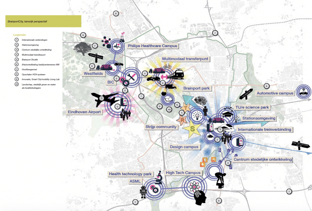 Het uitgangspunt daarvan is verbinden. In letterlijke zin betekent dat het verbeteren van vervoer van en naar de hotspots, zoals de High Tech Campus en ASML. Aan de andere kant staat het verbinden in uiterlijke zin waarbij de Eindhovense identiteit van kennis, techniek en design in terugkomt.