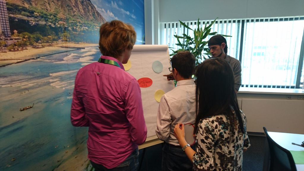 Eenmaal terug in de conferentie zaal worden de teams opgesplitst in groepjes om na te denken over IoT toepassingen die óf de industriële productie vooruit helpen óf security systems verbeteren. Alle groepen krijgen een ruimte toegewezen. Om hun idee uit te werken maken ze geen gebruik van high tech snufjes, maar van een ‘ouderwetse’ koffer vol stiften en post-its. De ene groep gaat heel schematisch te werk en bedenkt een case study om een oplossing tot in detail uit te werken, andere groepen komen met zoveel mogelijk oplossingen en ideeën om ze vervolgens onder te verdelen in categorieën.