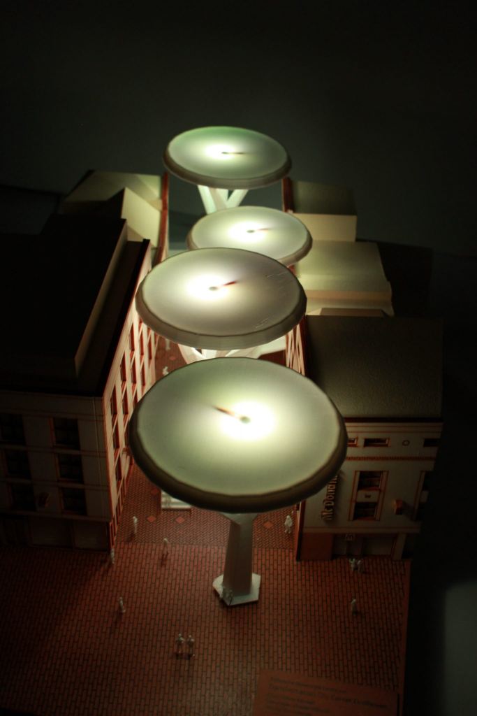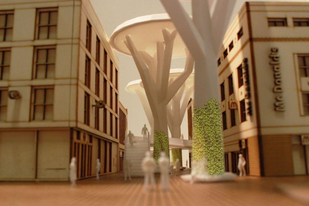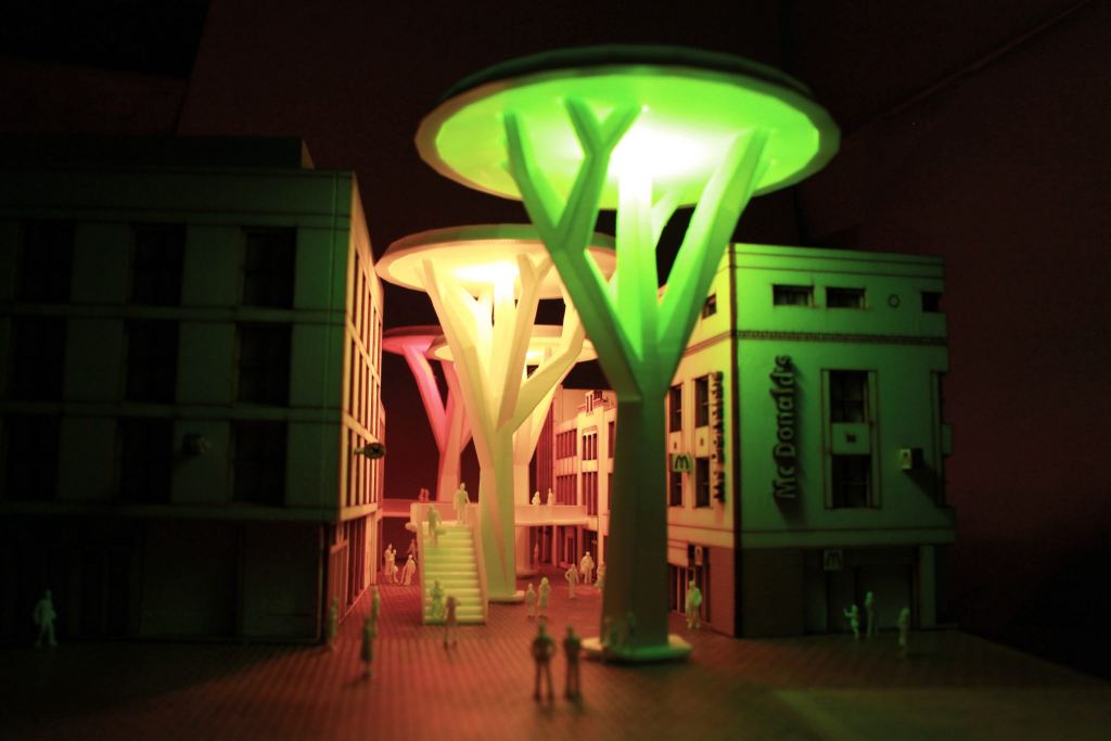 Een ander concept is ontwikkeld door master student Ilke Broers. Ook zij focuste zich op het boosten van de Demer. “Ik kwam er al heel snel achter dat er nergens plannen zijn om dit gebied te vergroenen. Dit is gek, want als je de berichtgeving erop nakijkt profileert Eindhoven zich als groene stad. Maar in de Demer zie je daar helemaal niets van terug.” Broers bedacht een ‘tweede-level’ waar shoppers kunnen genieten van het groen. Een groenplateau dat niet alleen door de Demer loopt, maar door heel de binnenstad zou kunnen lopen als het aan haar ligt. “Simpel bomen en bankjes neerzetten ‘boost’ de binnenstad niet echt, hiermee geef je bezoekers een nieuwe ervaring die je ook zou door kunnen trekken.” Broers heeft lang nagedacht over het daglicht. “De plateaus mogen niet te breed zijn, want dan wordt het op straatniveau te donker. Met een lichtstudie ben ik nagegaan dat 6meter hoog genoeg is om voldoende licht door te laten. En voor de donkere maanden zijn de plateaus aan de onderkant verlicht.”
