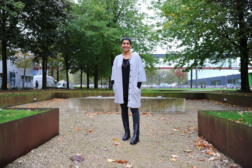 Het is een grijze, regenachtige dag wanneer we Sukanya ontmoeten. Ze staat voor Vertigo, het gebouw van de faculteit waar ze werkt. We worden begroet met een warme glimlach en ze vraagt waar we heen willen voor het interview. We kiezen het Metaforum. Het is bijna lunchtijd en daarom zijn we niet de enigen die richting dat gebouw gaan. “Het is nog steeds niet koud, dus laten we van de frisse lucht genieten,” zegt Sukanya terwijl we een fijne plek buiten vinden waar het droog en stil is.