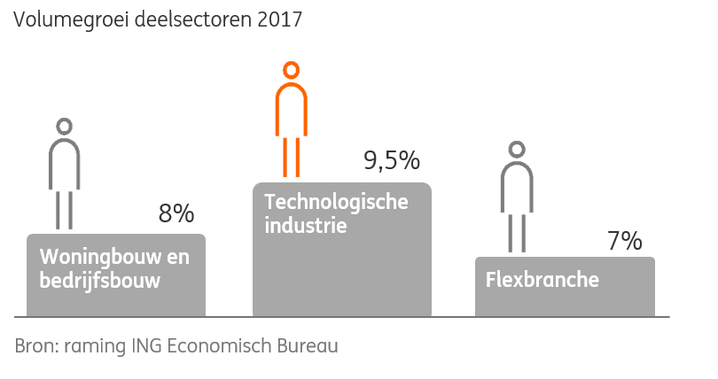 Maar het gaat niet alleen om het aantrekken van nieuwe mensen. ING: “Het mag duidelijk zijn dat de inspanning, zowel vanuit overheid als industrie, op het vlak van techniek onderwijs eerder meer dan minder moet worden. Maar de veranderingen reiken verder: werk verandert en medewerkers zullen mee moeten veranderen. Ook daar wordt continue scholing gevraagd. Daarnaast zullen organisaties platter en qua personeelssamenstelling meer divers worden om sneller in te spelen op nieuwe ontwikkelingen. Management zal hierbij minder directief worden, en meer inspirerend. Dit is slechts een kleine greep uit de transformatie die de sector zal moeten ondergaan om de huidige rol als groeimotor in Nederland ook op termijn vast te houden.”