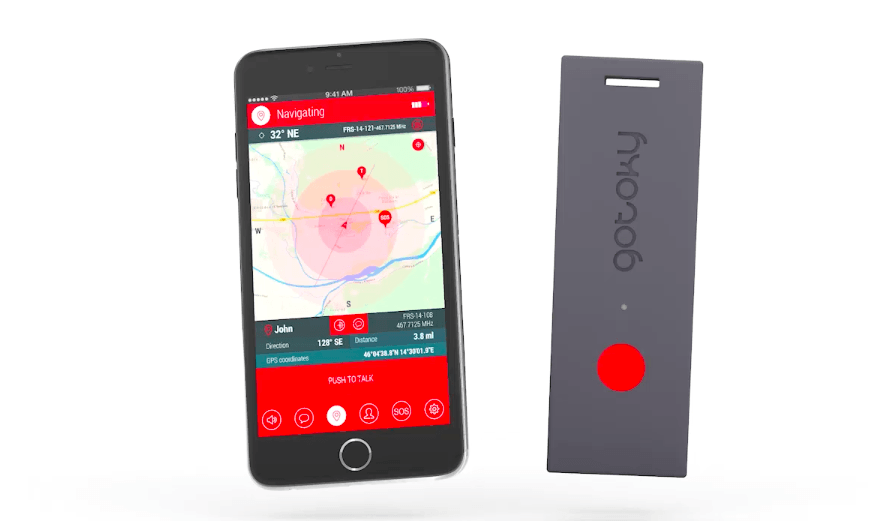 Het concept van Gotoky in het kort: een kleine device dat samen met je eigen smartphone als walkietalkie functioneert. Eentje waarmee je naast praten ook kunt sms-en en die een GPS en SOS functie heeft. De walkietalkie werkt op radiofrequenties en is niet afhankelijk van je mobiele netwerk of van satellieten. Ook als je dus geen bereik hebt met je telefoon kun je via Gotoky nog communiceren. In de bergen tot zo’n 14,5 kilometer.