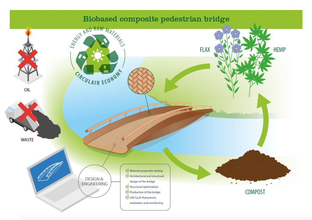 Met deze brug willen de initiatiefnemers de potentie aantonen van biocomposiet als een duurzaam alternatief voor bestaande milieubelastende constructiematerialen. “Met het gebruik van biocomposiet in constructies verminderen we onze afhankelijkheid van eindige fossiele grondstoffen en komen we een stap dichterbij de circulaire economie waarbij producten en grondstoffen hergebruikt worden”, aldus Blok. “Op termijn verwacht ik dat we zulke materialen ook steeds meer in gebouwen gaan zien.”