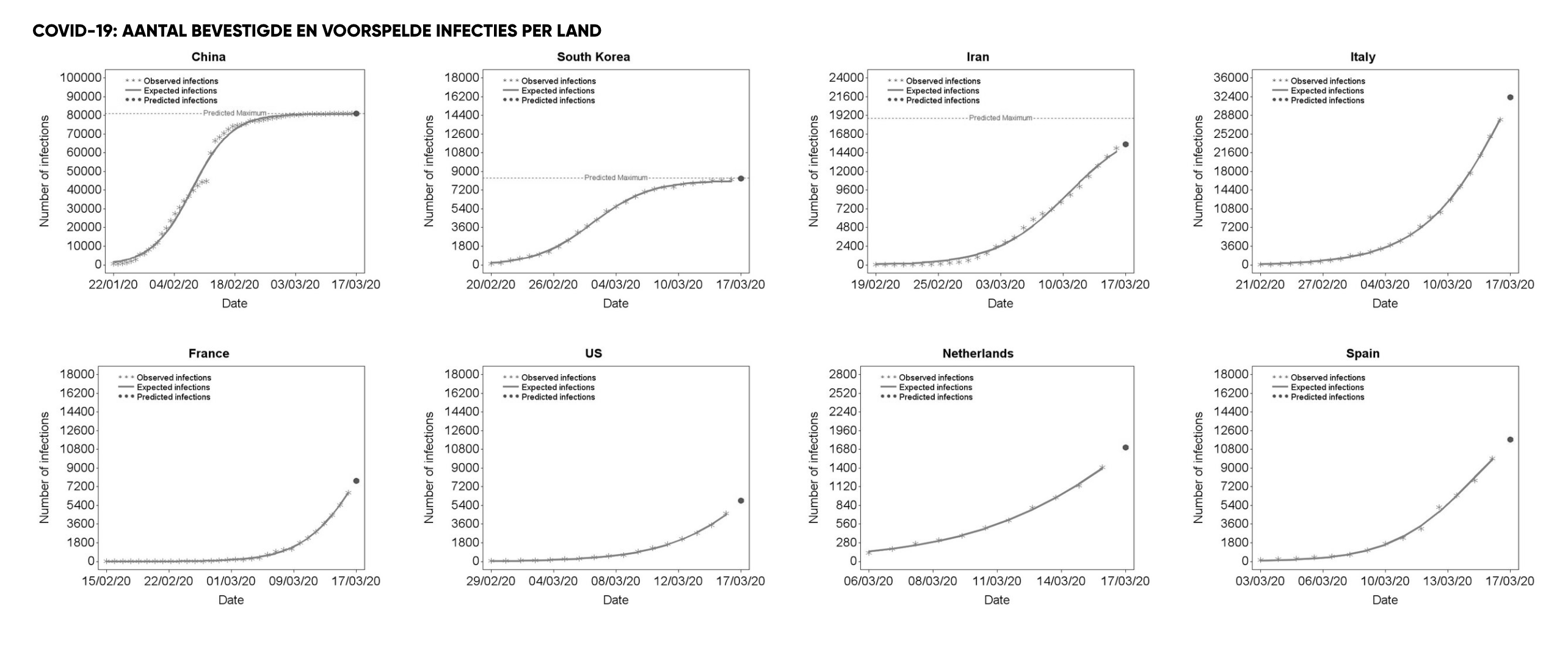 Het aantal infecties en doden China blijft de komende dagen stabiel, volgens de onderzoekers. In Iran en Zuid-Korea begint de groei in aantal infecties de komende dagen af te vlakken. Het uiteindelijke maximum voor Zuid-Korea en Iran schatten de onderzoekers momenteel op respectievelijk ruim 8.300 en 19.000 besmettingen. In Italië zet de forse stijging naar verwachting verder door, tot mogelijk 70.000 besmettingen. Dat is overigens minder dan een aantal dagen terug nog werd verwacht.