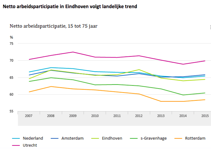 In vergelijking tot de vier andere grote steden van Nederland presteerde Eindhoven gemiddeld. In Rotterdam en Den Haag waren minder werkenden en meer werklozen. Amsterdam en Utrecht deden het juist beter.