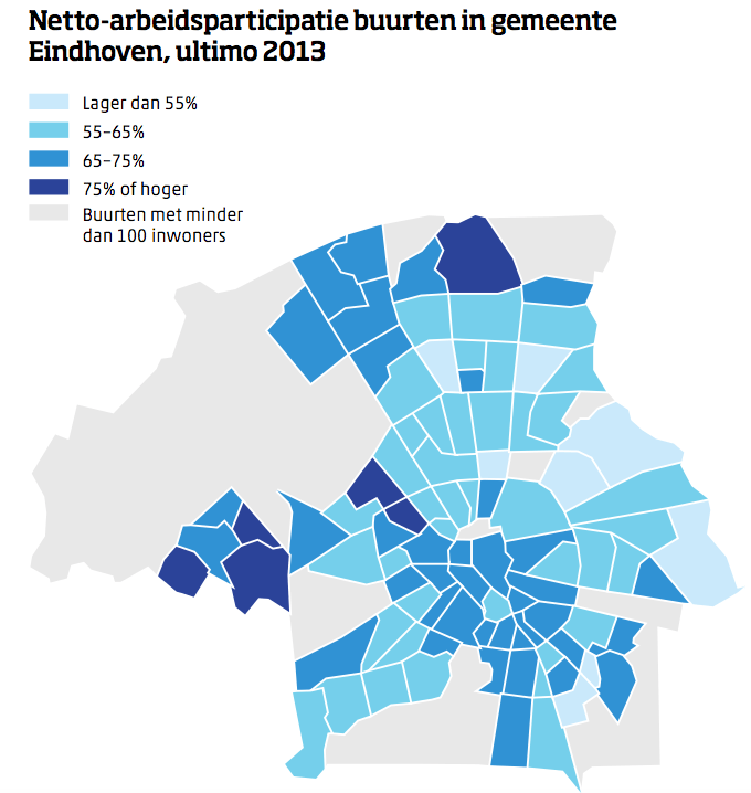 In 2015 kende Eindhoven 10.000 werklozen, ofwel 8,1 procent van de beroepsbevolking. Het landelijk gemiddelde lag in dat jaar op 6,9 procent. De wijken Tivoli en Oude Toren hadden eind 2014 de laagste arbeidsparticipatie van heel de stad, met respectievelijk 49,7 en 48,4 procent werkenden. Het westen en Noorden van de stad hadden de hoogste participatiegraad. De buurten Zwaanstraat en Bosrijk presteerden met 90,2 en 88,1 procent het best. De wijkcijfers van 2015 waren vrijdag nog niet beschikbaar en volgen later.