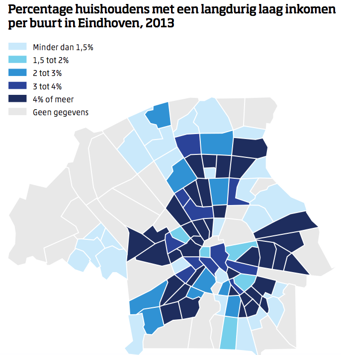 Het risico op langdurige armoede ligt in Eindhoven evenwel lager dan in de andere grote steden, met 3,7 procent van de huishoudens. Utrecht doet het even goed terwijl de andere drie het beduidend slechter doen. Amsterdam bungelt onderaan met een risicopercentage van 6,8 procent. Het landelijk gemiddelde ligt overigens op precies 3 procent.