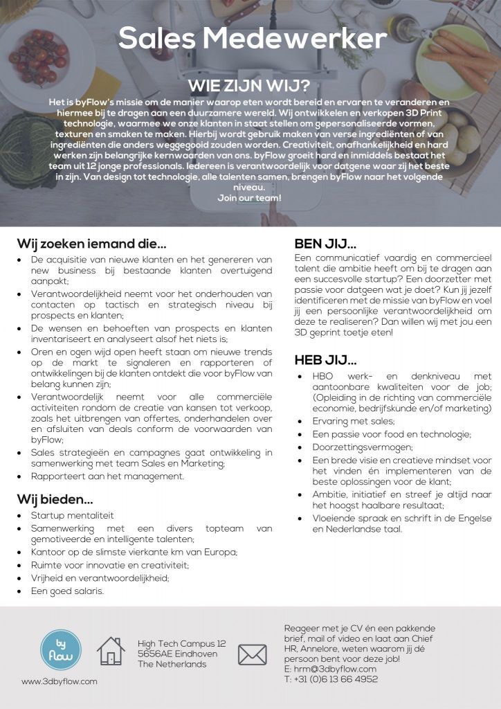 byFlow gaat de wereld veranderen op een duurzame manier, waarbij we de bereiding en ervaring van eten radicaal veranderen. Dit doen we met de beste 3D Food Print technologie van de wereld, waarmee we onze klanten in staat stellen om gepersonaliseerde vormen, texturen en smaken te maken. Creativiteit, innovatie en hard werken zijn belangrijke kernwaarden van ons. Gaat jouw hart sneller kloppen van prachtige designs, lekker eten en wil je ook iets bijdragen aan de wereld? Join het byFlow team en verover de Food Print wereld!