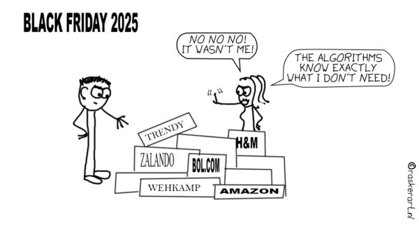 Net als dat mensen over algoritmes flink wat vooroordelen hebben: “Ze vragen zich af of we nog een vrije wil houden met al die AI. Black Friday en algoritmes die uit zichzelf aankopen doen, zijn dan mooie onderwerpen om een soort gimmick van te maken. Vaak ontstaat dat pas tijdens het tekenen en andere keren zie ik het gelijk voor me.”