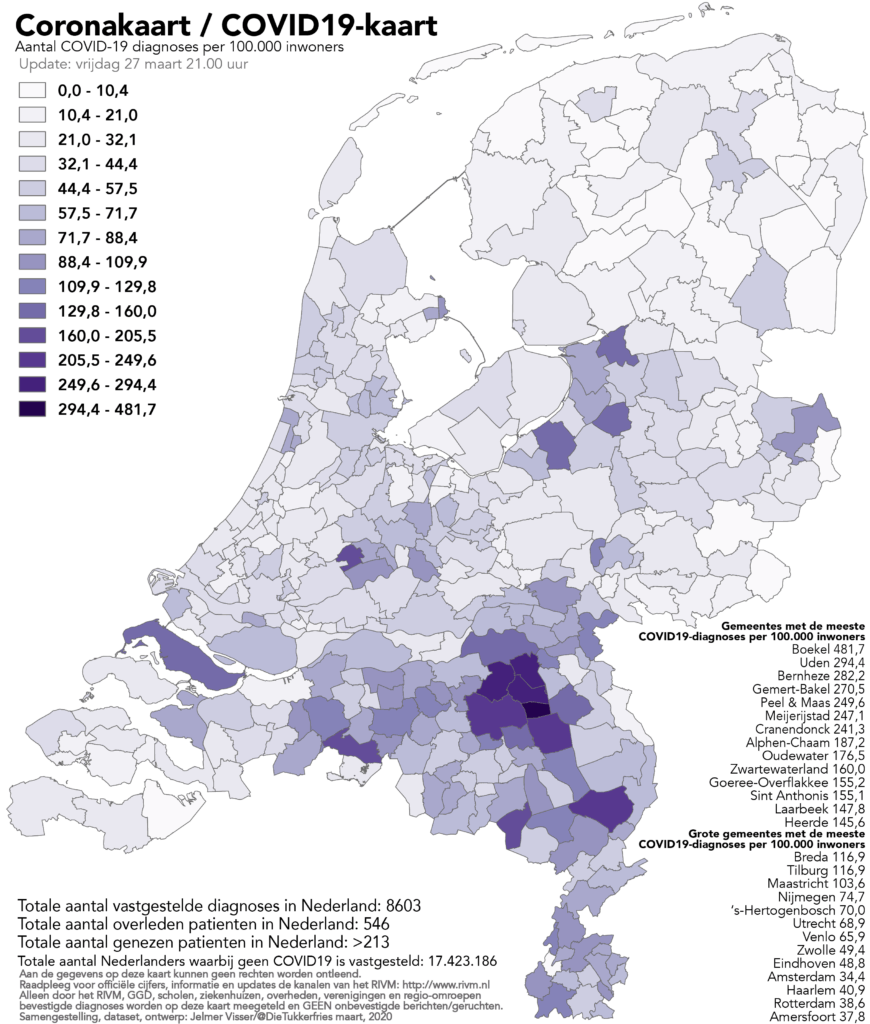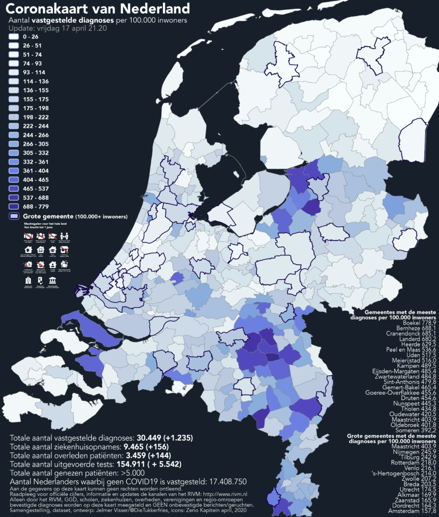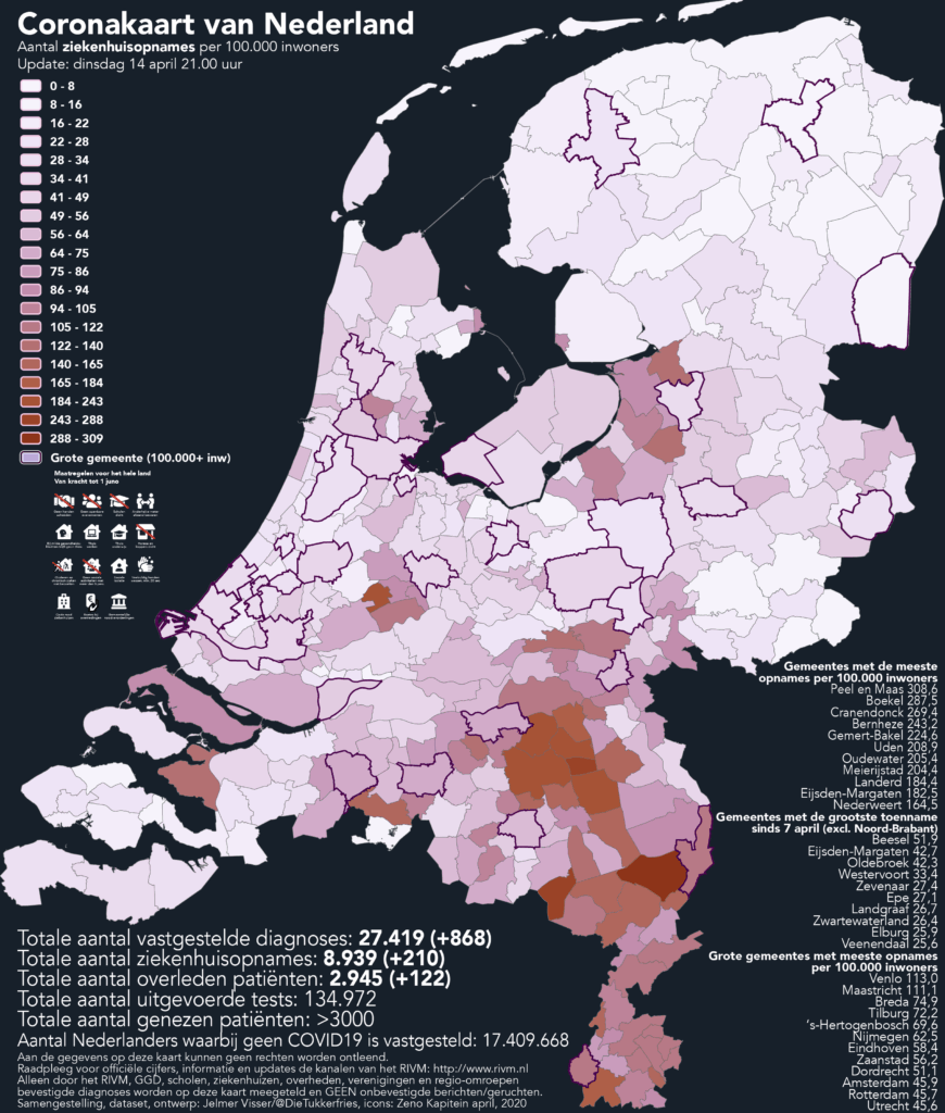 Hoe accuraat dit tijdspad precies zichtbaar wordt op de Nederlandse kaarten, hangt samen met het aantal uitgevoerde tests. Op dit moment zijn er in Nederland 147.948 personen getest op het virus. Dat lijkt nog lang niet genoeg te zijn. Als de sterftecijfers van aankomende periode dezelfde trends laten zien als de sterftekaart van dinsdag 14 april en de diagnosekaart van zaterdag 10 april, dan lijkt er een stap in de goede richting gezet te zijn.