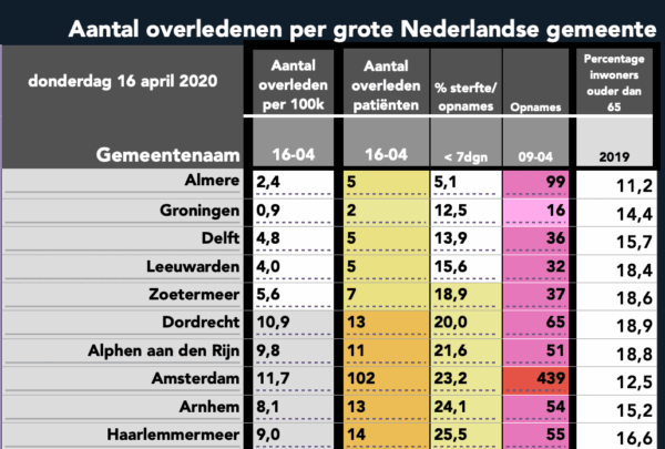 Dit patroon is in Almere juist omgekeerd. Daar zijn 94 van de 99 patiënten die een week eerder in het ziekenhuis waren opgenomen op 9 april nog in leven. Hoe dit mogelijk is? Almere kent met slechts 10,8 procent bijna het laagste percentage ouderen van alle Nederlandse gemeenten terwijl de gemiddelde leeftijd van een sterfgeval als gevolg van Covid-19 doorgaans boven de zeventig ligt. Dit lijkt dan ook een plausibele verklaring voor het lage aantal overledenen in de ‘jongste stad van Nederland‘. In Hoeksche Waard (10,8%), Lelystad (14,3%) en Delft (13,9%) is een soortgelijk effect te zien.