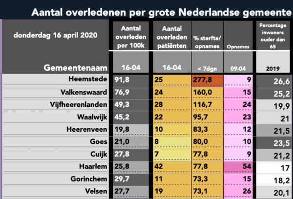 Is dit helemaal waterdicht? Absoluut niet. Correlatie is geen causatie; kijk maar naar de sterftepercentages in relatie tot het aandeel 65-plussers van Haarlem ten opzichte van het even verderop gelegen Haarlemmermeer. Dit volledige databestand voor de situatie in jouw gemeente is overigens terug te vinden via Google Sheets.