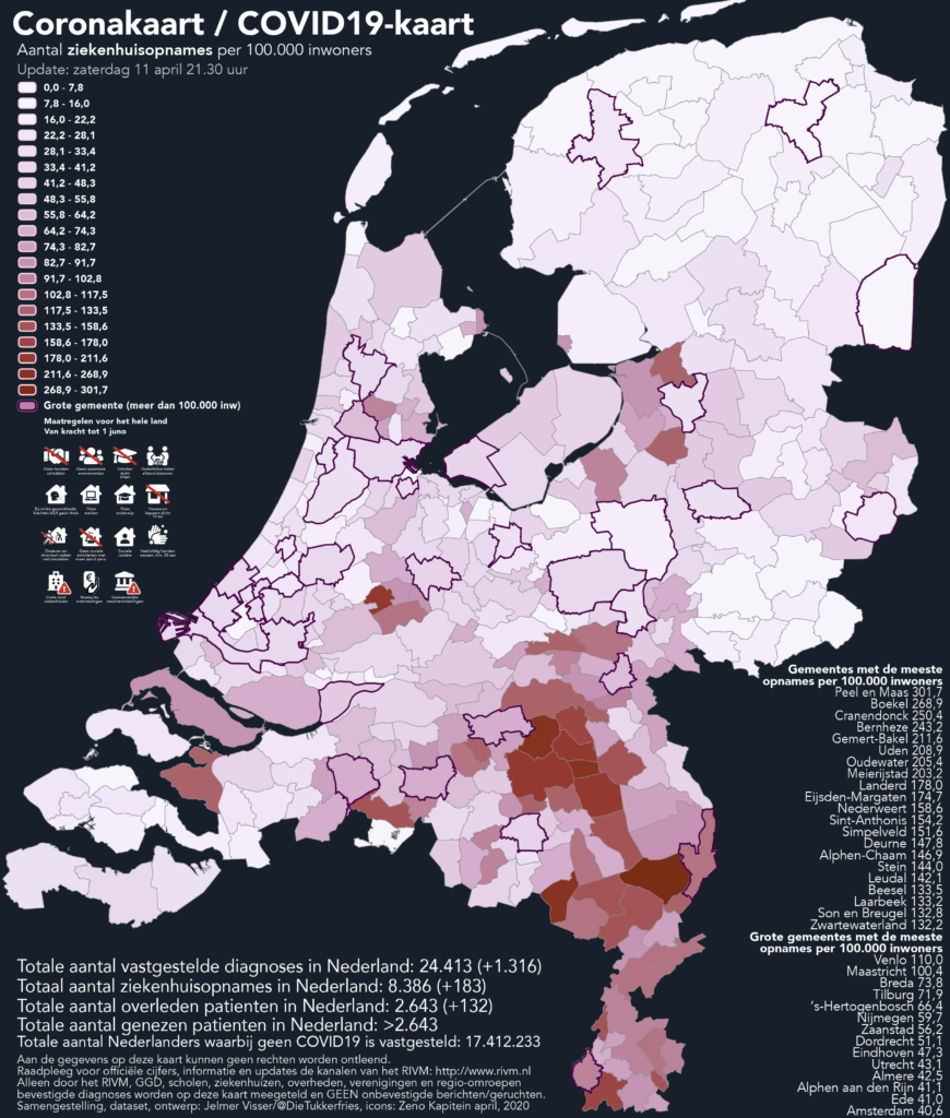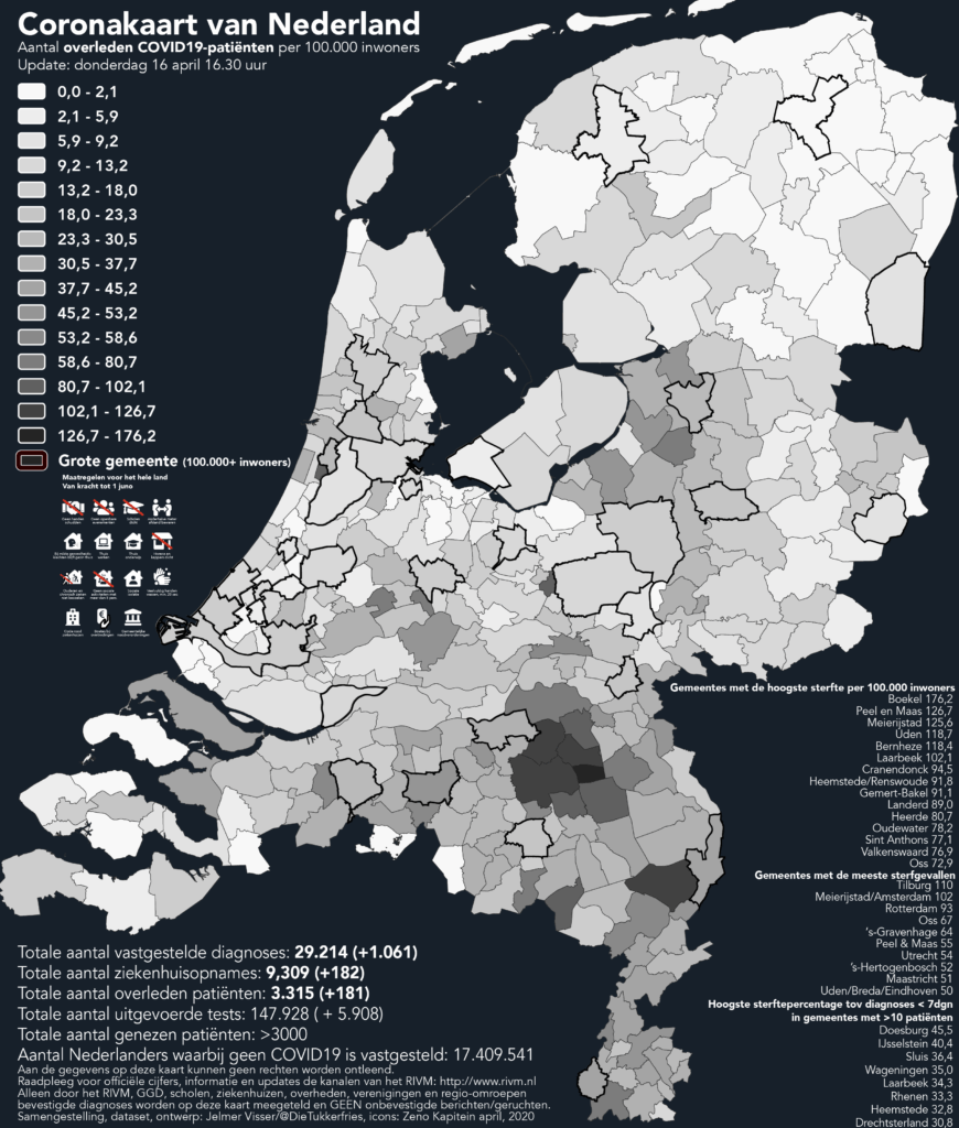 Het landelijke beeld, waar het gaat om sterfte, vertoont grote overeenkomsten met die over ziekenhuisopnames en diagnoses. De gemiddelde leeftijd van een sterfgeval door Covid-19 is doorgaans hoog. Daarom zijn stedelijke gemeenten – waar de bevolking gemiddeld jonger is – op deze kaart over het algemeen lichter gekleurd dan rurale gebieden. Dat relatief de meeste overlijdens zijn te betreuren in Boekel en Peel en Maas, was te verwachten. Het Brabantse Boekel kent al sinds medio maart de meeste diagnoses per 100.000 inwoners terwijl de Limburgse gemeente te kampen heeft met relatief de meeste ziekenhuisopnames. Ook de rest van de Brabantse brandhaard is duidelijk zichtbaar. Net als dat de Zwolse haard en de getroffen ‘grijze’ bible-belt-gemeentes donkerder zijn dan de omgeving.