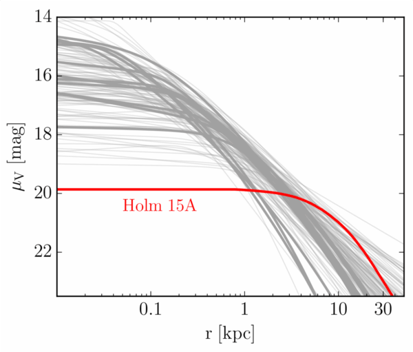 Het lichtzwakke centrum van het stelsel met slechts weinig sterren lijkt weliswaar op andere elliptische stelsels, maar deze is veel meer uitgesproken. ,,Het lichtprofiel in de binnenste kern neemt richting centrum ook niet meer toe,´ Kianusch Mehrgan, die verantwoordelijk was voor de data-analyse. „Dat houdt in dat de meeste sterren op grond van hun interactie bij voorgaande versmeltingen door zwarte gate uit het centrum zijn geslingerd.´