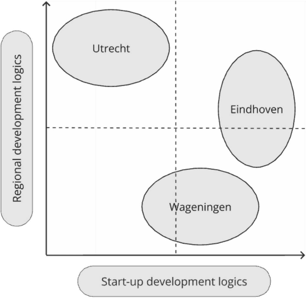 The research identifies two dominant institutional logics that shape ecosystem behavior: regional development logic and startup development logic.